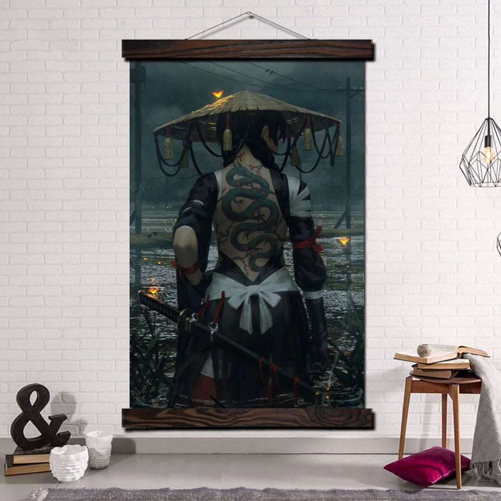 Plongé au milieu de la nuit ce tableau japonais moderne samouraï nous fait entrer dans un univers très particulier avec son samouraï au tatouage de dragon.