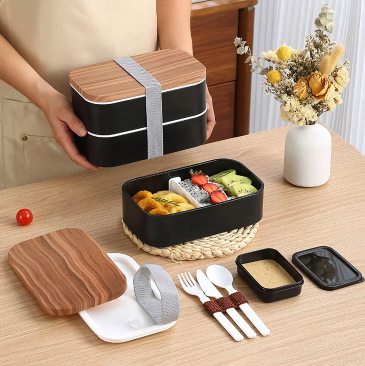 La boîte bento japonaise avec couverts est conçue pour les amateurs de cuisine japonaise et pour ceux qui apprécient l’art de vivre à la japonaise. Son couvercle en bois naturel non seulement préserve la fraîcheur de vos aliments, mais sert aussi de support à un ensemble de couverts assortis, vous garantissant un repas complet où que vous soyez. Compacte et légère, elle se glisse facilement dans un sac ou un cartable sans encombrement superflu.
