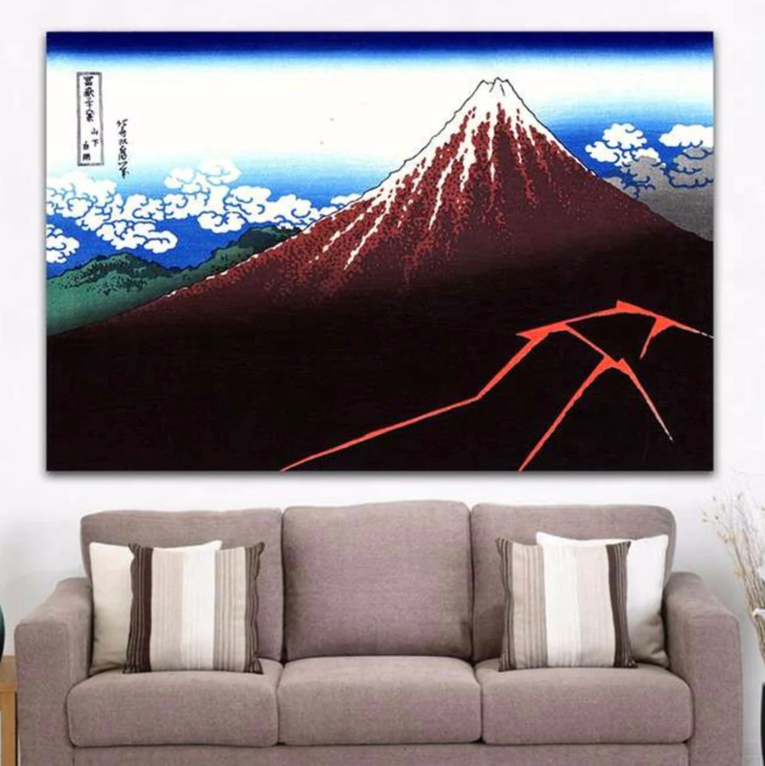 Cette reproduction d'estampe qui représente le Mont Fuji sous une apparence volcanique et orageuse est en réalité une œuvre d'un des plus grands maîtres japonais de l'ukiyo-e. Ce tableau se nomme « L'orage sous le sommet » et appartient à une série d'estampes nommée « Trente-six vues du Mont Fuji » que Hokusai a réalisé dans les années 1830.
