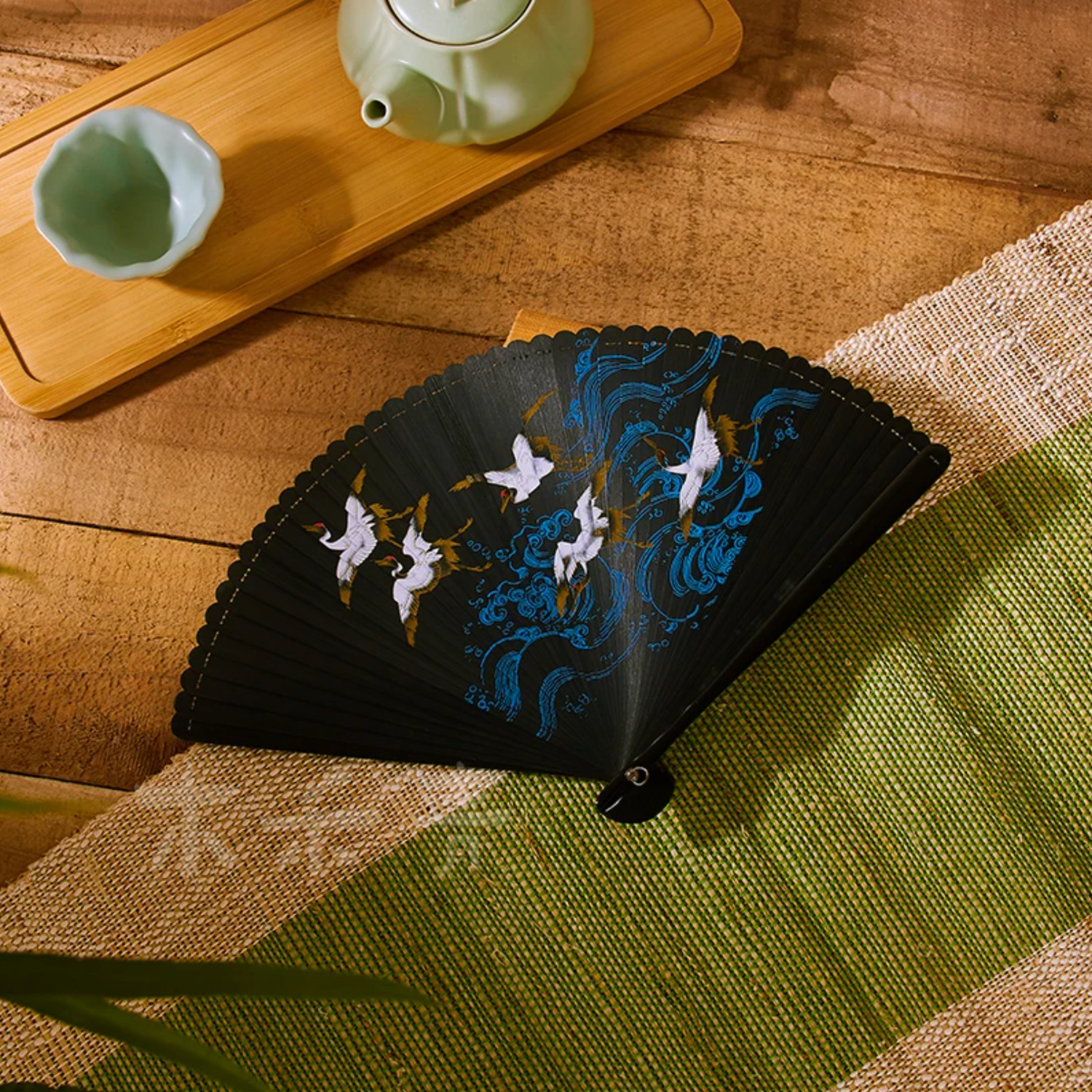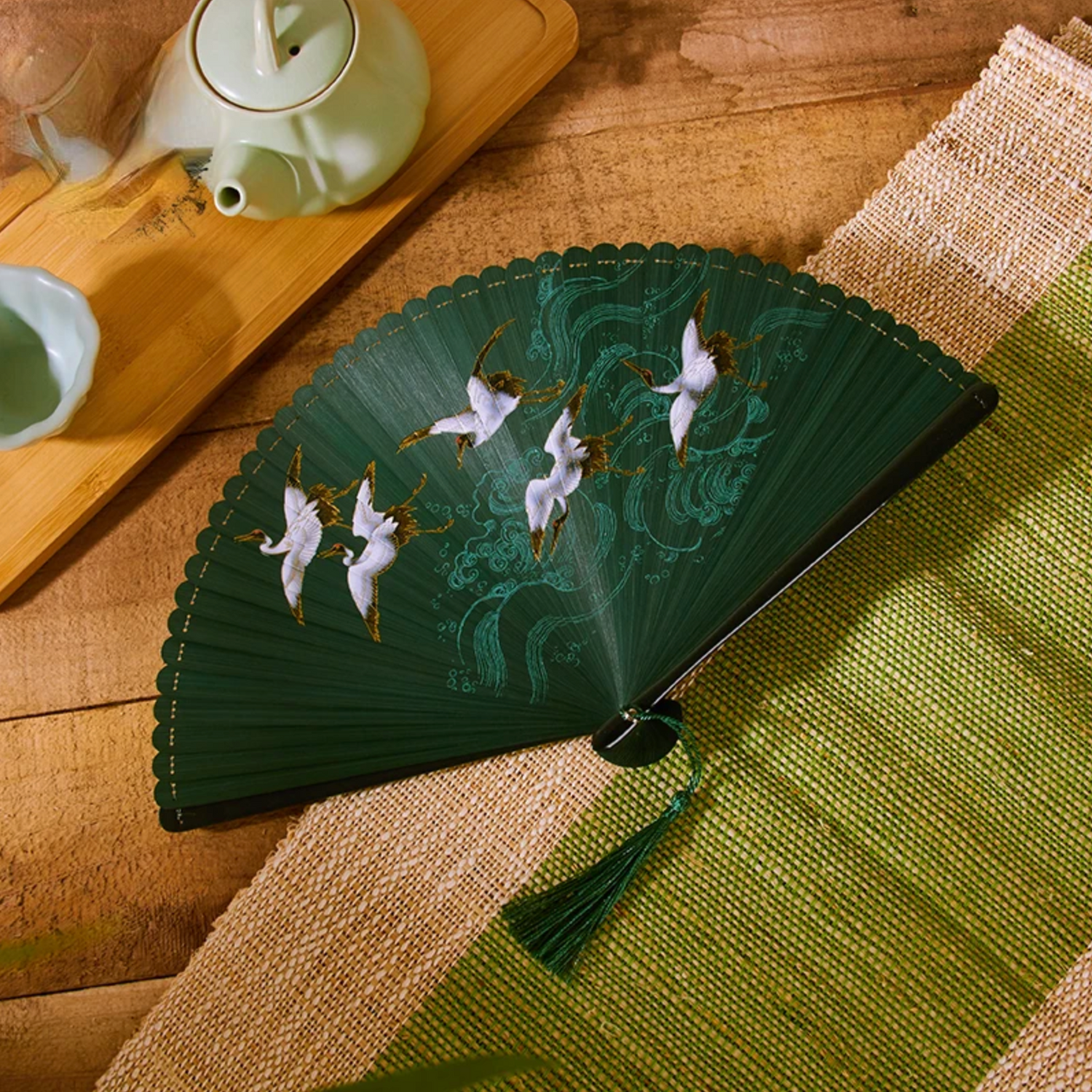 Disponible en trois coloris captivants – vert, noir et jaune – cet éventail japonais avec grues apporte une touche luxueuse à votre collection d'accessoires. Son armature en bambou pliable assure non seulement sa durabilité, mais aussi sa facilité d'utilisation, vous offrant une brise rafraîchissante associée à une esthétique irréprochable.