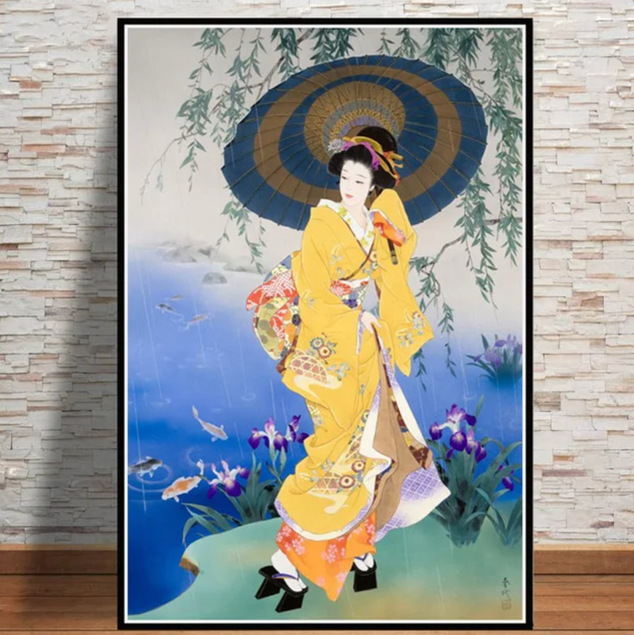 Immergez-vous dans l'élégance pluvieuse avec le tableau japonais geisha pluie