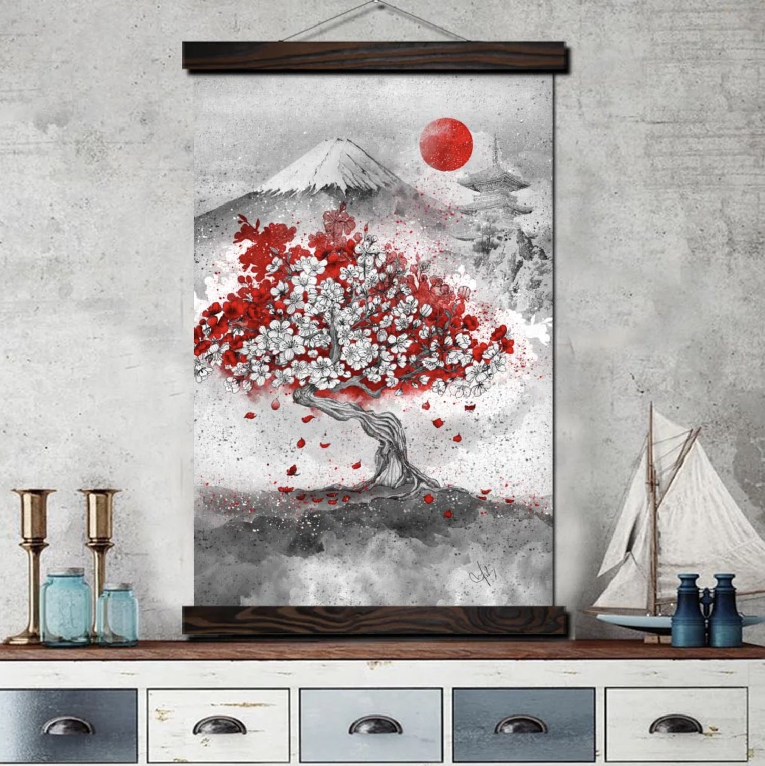 Ce tableau japonais mont Fuji est une invitation à voyager depuis le confort de votre intérieur. Représentant le majestueux Mont Fuji surplombé d'un ciel rougeoyant, cet art mural capture l'essence de la sérénité japonaise. Au premier plan, un cerisier en fleurs éclatant de rouge et blanc offre une représentation éblouissante de la nature. Les nuances subtiles de gris et de rouge de ce tableau japonais mont Fuji apportent une touche de calme et de sophistication à tout espace de vie, fusionnant la tradition et la modernité dans une harmonie visuelle exceptionnelle.