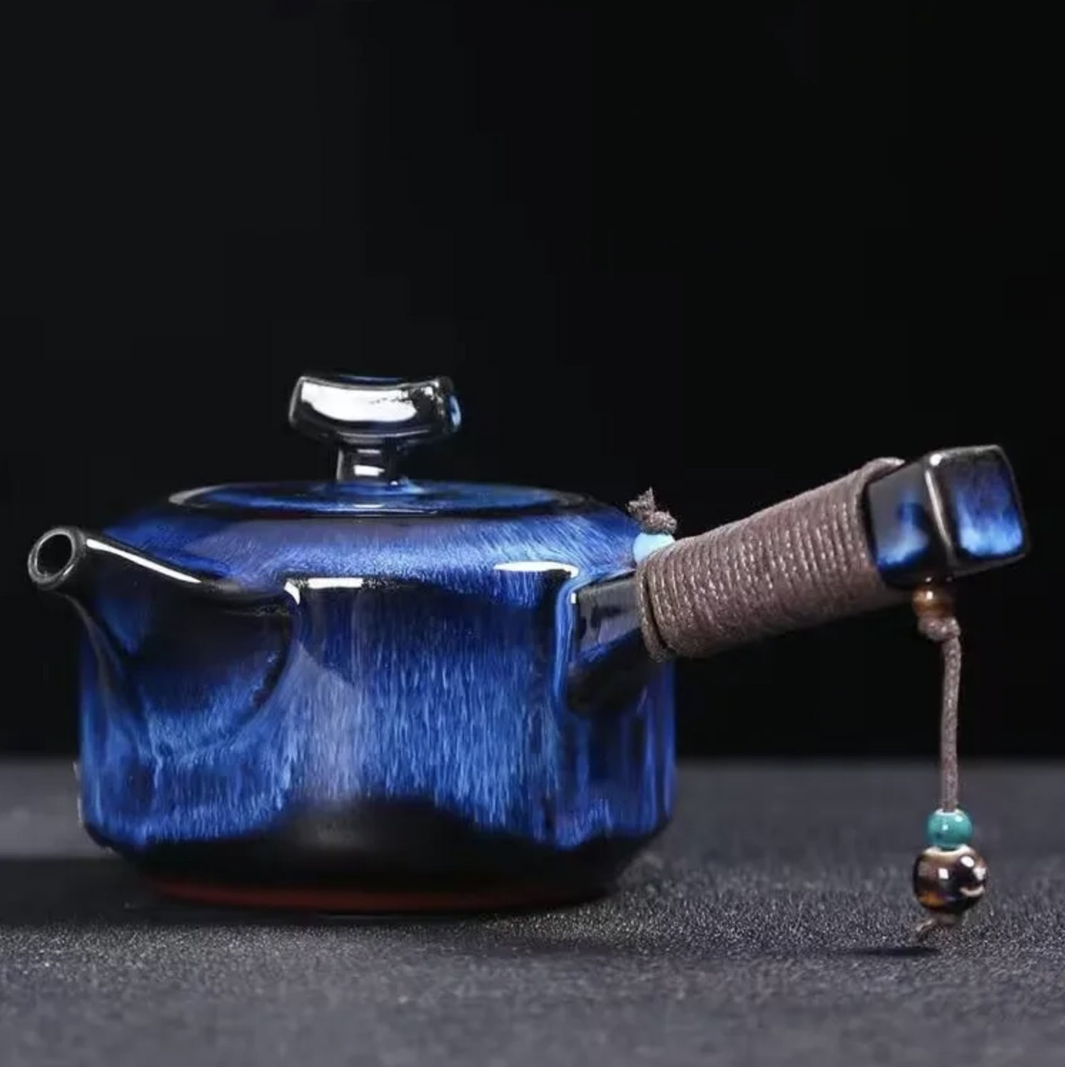 Chaque théière japonaise kyusu porcelaine bleue est conçue pour être un objet de tous les jours autant que de collection. Sa forme traditionnelle kyusu, spécialement pensée pour l'infusion des thés verts japonais, permet de préserver et de révéler les arômes les plus délicats. La poignée latérale est soigneusement enveloppée pour une prise en main confortable et sûre, ajoutant une touche artisanale à l'ensemble.